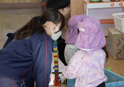 本日、ふれあい体験2クラス目でした。今回は、2時間目の時間帯に行かせていただきました。すでに登園している園児と一緒に遊んだり、園庭での遊びを一緒に楽しんでいました。