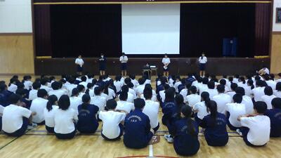 本日学年集会を行い、学級委員から1学期の振り返り、夏休みの生活、学習について、水上自然教室のまとめ発表と盛り沢山な内容でした。水上の発表では各クラスの代表ということもあり、内容もプレゼンの仕方も流石でした。充実した夏休みを過ごし、2学期も頑張っていきましょう。
