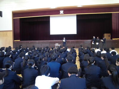 昨日、今学期最後の学年集会を行いました。各クラスの学級委員がクラスの様子を語ってくれました。体育祭や合唱祭の行事を通して団結力やクラスメイトの新しい一面を発見できたようです。終業式では吹奏楽部の表彰や英語のスピーチコンテストで活躍した生徒の発表など学年の代表として堂々とした立ち居振る舞いでした。明日から短い冬休みに入ります。生徒に進路のことを考えてもらうために興味のある職業についてまとめる「夢新聞」や高等学校調べが課題となっています。55期生の新年が晴れやかで飛躍の1年になることを祈っています。それではよいお年を。